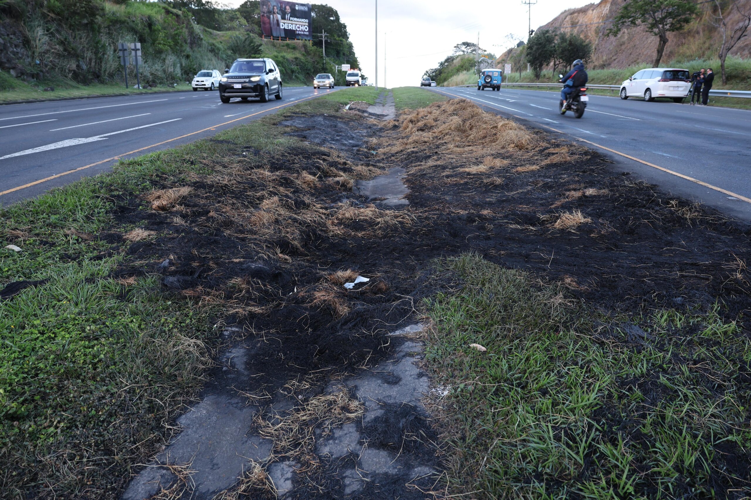 Durante el recorrido se observó pasto completamente quemado, restos del camión involucrado y presencia de humo, evidencia del fuerte incendio ocurrido la tarde anterior y que provocó una emergencia vial importante.