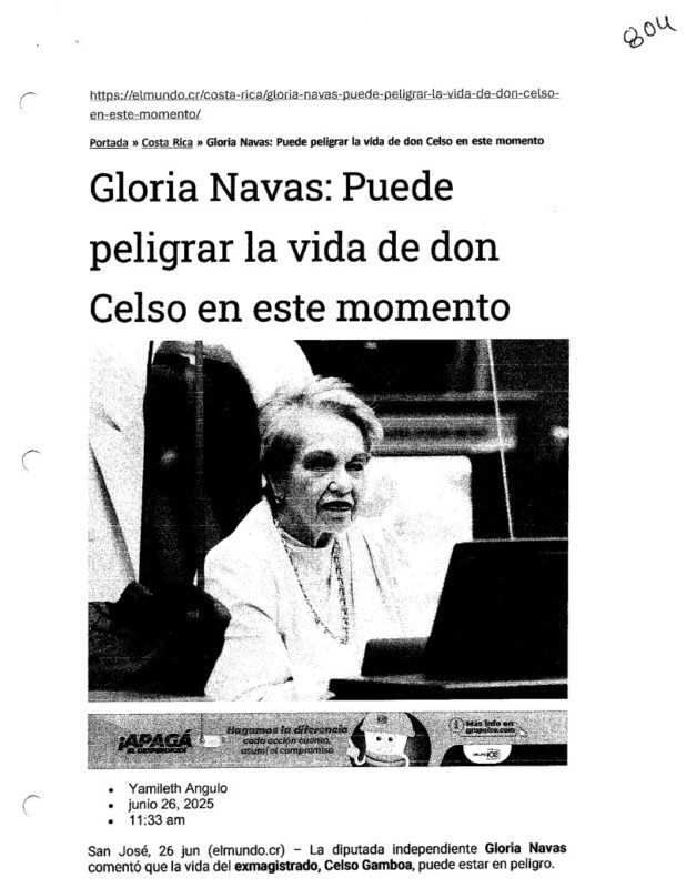 “La vida de Don Celso podría estar en peligro”Navas dijo durante una sesión de la Comisión de Seguridad y Comercio de Drogas en la Asamblea Legislativa, señalando que su permanencia en estas condiciones podría tener graves consecuencias.